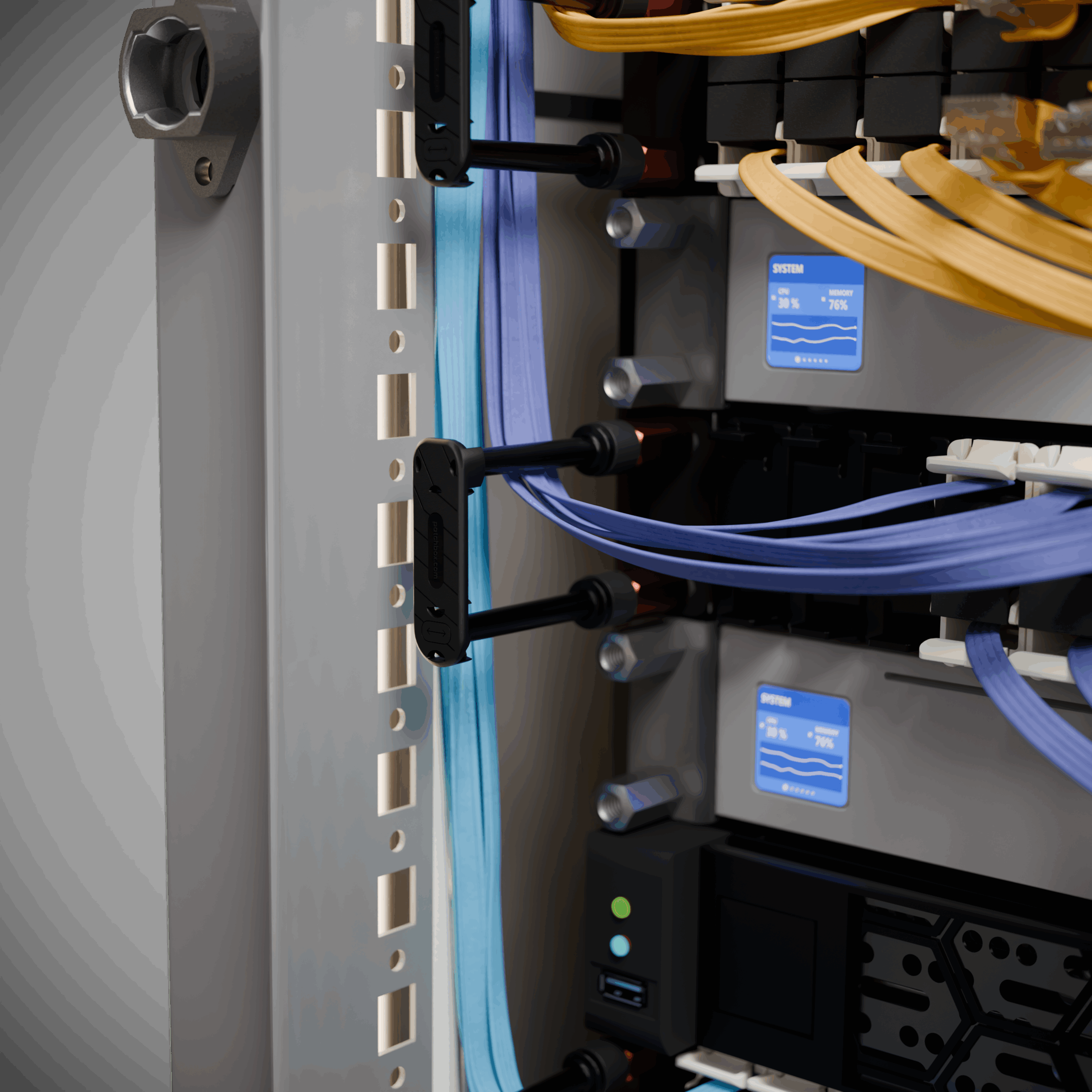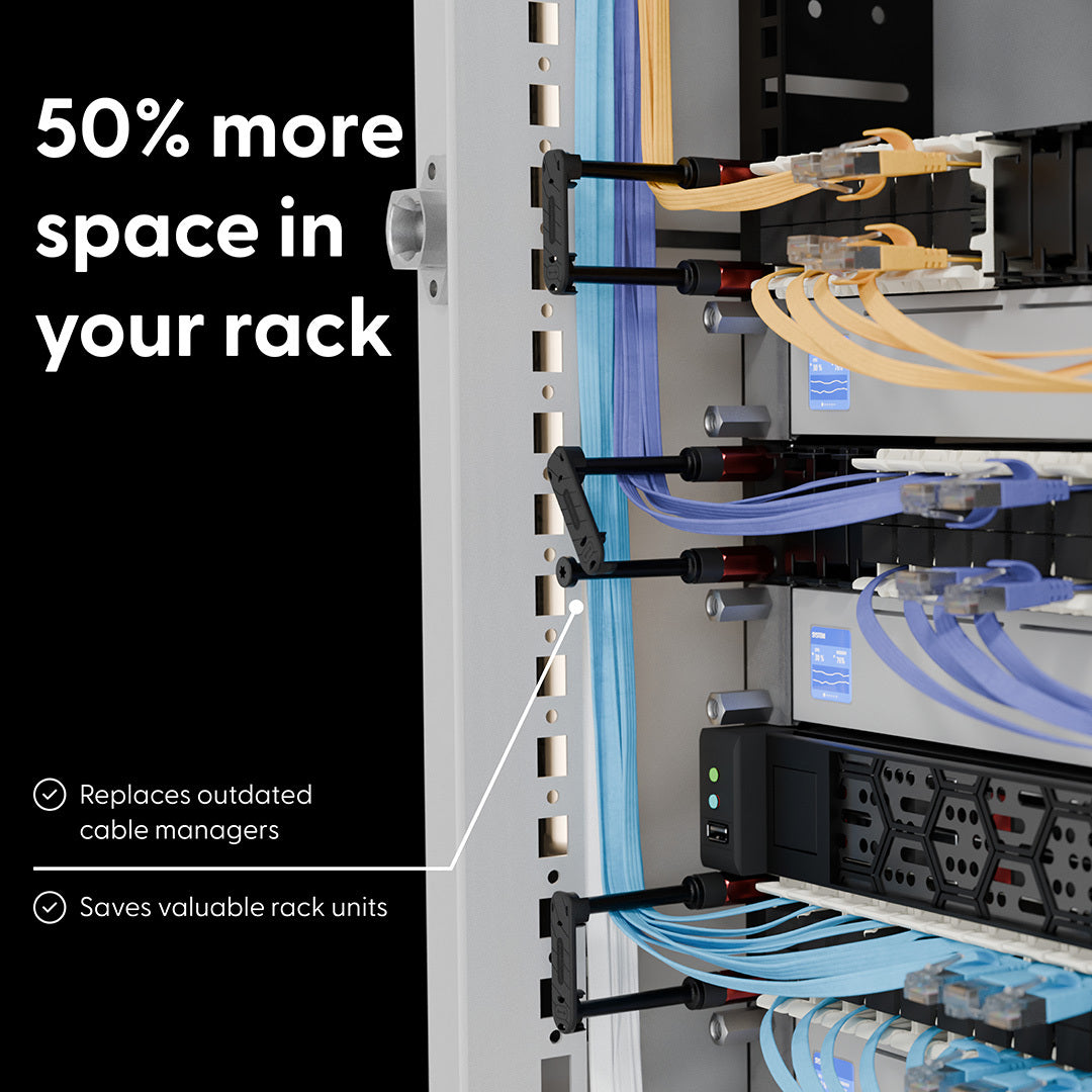 Secure hardware and manage cables across up to 12 rack units with one 24-pack, without wasting rack space on conventional cable managers.